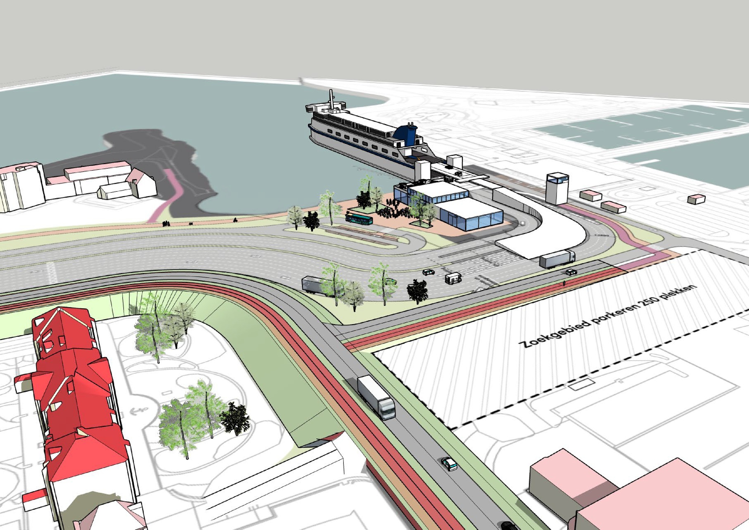 We are investigating whether partial filling of the ferry port’s harbor basin can contribute to extra (business) space, parking, better accessibility and an attractive environment.